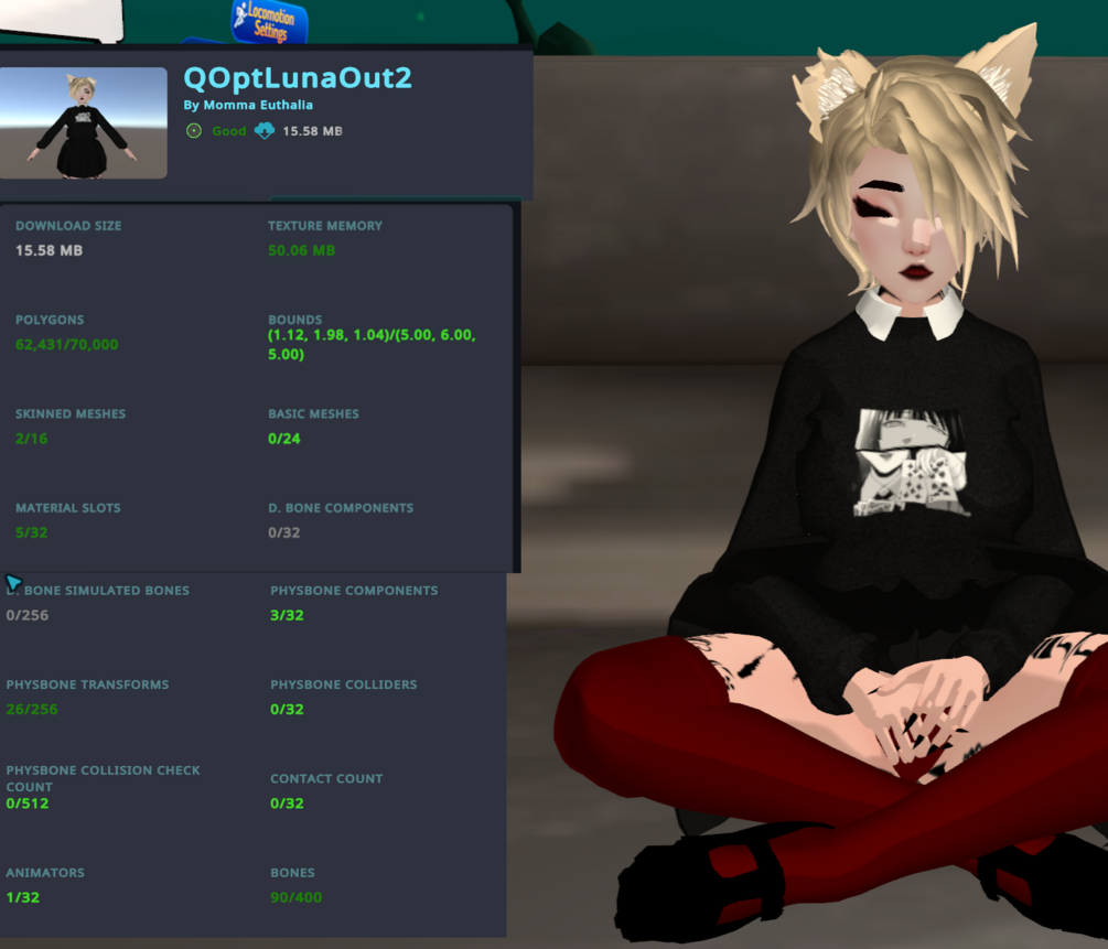 While testing Lunafreya in-game with help of a few questie friends some toggles for the main version (not Optimized versions) that you can see PC side (hair style toggles, outfit toggles) will not be visible Quest side. I recommend you upload the Quest version on a completely separate blueprint to the PC and use the Quest version as the PC and Quest versions of that separate upload. to avoid possible issues. I believe there are issues specifically due to the drastic difference in volume of toggles between the two versons but cannot be sure.